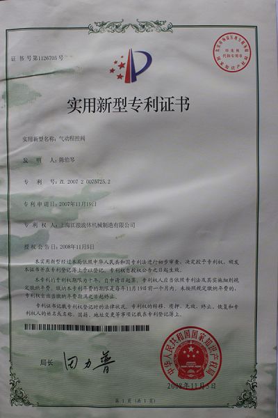 气动程控阀实用新型专利证书