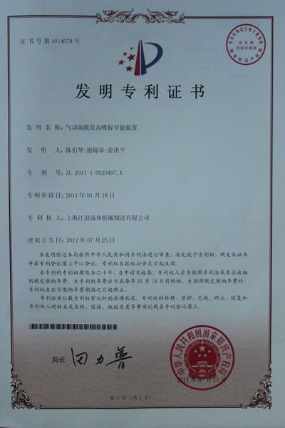 气动隔膜泵高吸尘发明专利证书